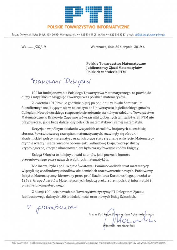 W dniach 3-7 września 2019 w Krakowie odbędzie się uroczysty Jubileuszowy Zjazd Matematyków Polskich z okazji 100-lecia powstania Towarzystwa Matematycznego (2 kwietnia 1919 roku w Krakowie), które wkrótce potem przekształciło się w Polskie Towarzystwo Matematyczne.