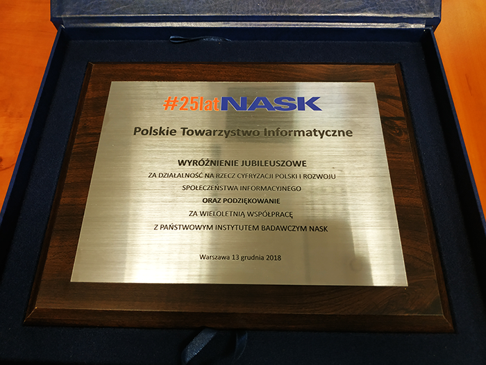13 grudnia br miała miejsce Gala z okazji 25-lecia powstania NASK - Naukowej i Akademickiej Sieci Komputerowej. Odsyłamy do krótkiego komunikatu nastronie NASK. W trakcie uroczystości przedstawiciele Instytutu wręczyli wyróżnienia wspólpracującym firmom i instytucjom, w tym dla Polskiego Towarzystwa Informatycznego.
