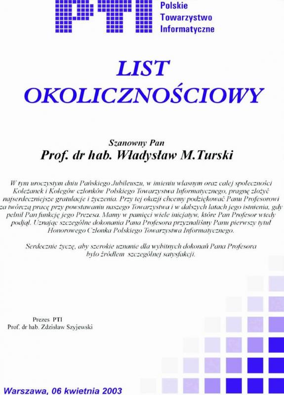 W 2003 konferencja The European Joint Conferences on Theory and Practice of Software (ETAPS), która odbyła się w Warszawie w dniach 5-13 kwietnia 2003 roku poświeciła jedną ze swoich sesji Jubileuszowi 65-lecia urodzin Profesora. Przypominamy List Okolicznościowy prof. Zdzisława Szyjewskiego złożony na ręce Jubilata.