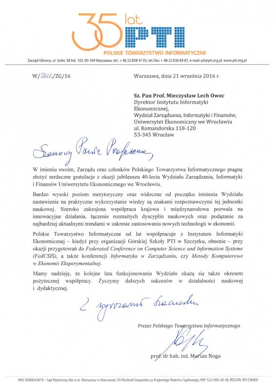 Koniec września to jubileusz 40-lecia powołania Wydziału Zarządzania Informatyki i Finansów Uniwersytetu Ekonomicznego we Wrocławiu. Nasze relacje zawsze były znakomite - pamiętamy świetnych wykładowcow i autorów referatów na Górskich Szkołach PTI w Szczyrku. Na ręce Kol. Kol. Heleny Dudycz i Mirka Dyczkowskiego składamy życzenia z okazji Jubileuszu z prośbą o ich przekazanie społeczności Wydziału. Czekamy na 50-lecie!