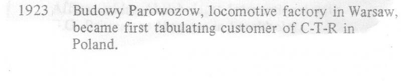 W tym roku mija 95 lat od dostawy kalkulatora firmy IBM (wtedy CTR - Computing Tabulating Recording Corporation) do warszawskiego przedsiębiorstwa opisanego w dokumentach dostawcy jako „Budowy Parowozow”. Dowód materialny zdobył Kol. Borys Czerniejewski korespondując z centralą firmy w Armonk w 2012 r. Jest to wyciąg z firmowego kalendarium, informujący o dostawie urządzenia do Polski w 1923 r.– zamieszczamy go poniżej.
