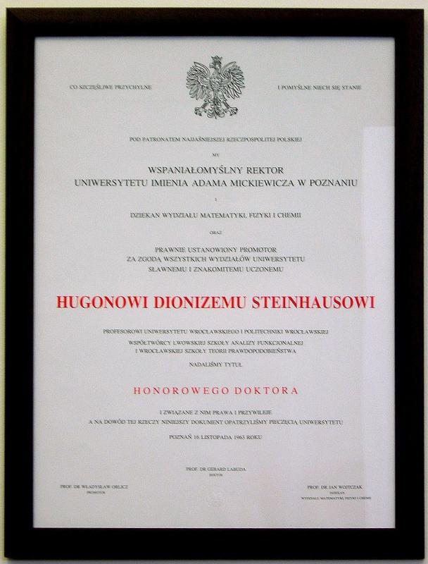 Przypominamy przemówienie Profesora Hugona Steinhausa wygłoszone w Uniwersytecie im. Adama Mickiewicza w Poznaniu przy nadaniu doktoratu honoris causa. Przemówienie wydrukowano w Wiadomościach Matematycznych R. VIII, 1965 r. Wg informacji ze strony UAM doktorat przyznano w dniu 11 marca 1963 r. Na dyplomie dostępnym w Wikipedii widnieje data 16.11.1963 r - prawdopodobnie wtedy odbyła się uroczystość nadania godności dr HC (prosimy o dodatkowe wyjasnienia od PT Czytelników). Promotorem był prof. Władysław Orlicz, a ówczesnym rektorem UAM - znakomity badacz słowiańszczyzny, prof. Gerard Labuda. Zaskoczeniem jest dyplom z odwołaniem do Najjaśniejszej Rzeczypospolitej z orłem w koronie - w 1963 r!