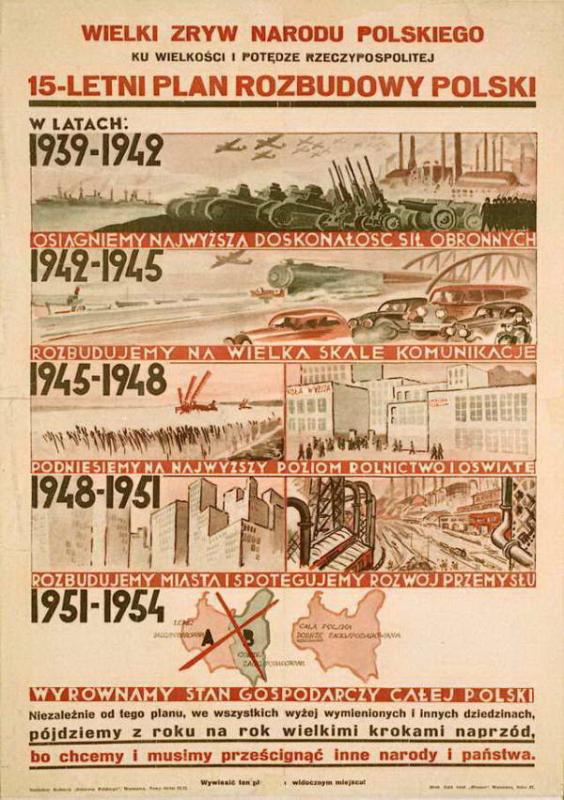 W atmosferze wizji osiagnięć gospodarczych przypominamy wystąpienie Wicepremiera inż. Eugeniusza Kwiatkowskiego w Sejmie w dniu 2 grudnia 1938 r. Ogłosił wtedy 15-letni plan rozwoju Polski. Świetnie to pokazuje ówczesny propagandowy plakat (zamieszczamy poniżej). Tekst wystąpienia do przeczytania w Monitorze Polskim nr 277/1938 (numer zawiera inne dość ciekawe ogłoszenia rządowe - warto poczytać), nabytym przypadkowo na Allegro. Plan był bardzo ambitny, realizację przerwała wojna, a praktycznie do dziś brak rzeczowej analizy szans powodzenia tego zamysłu.