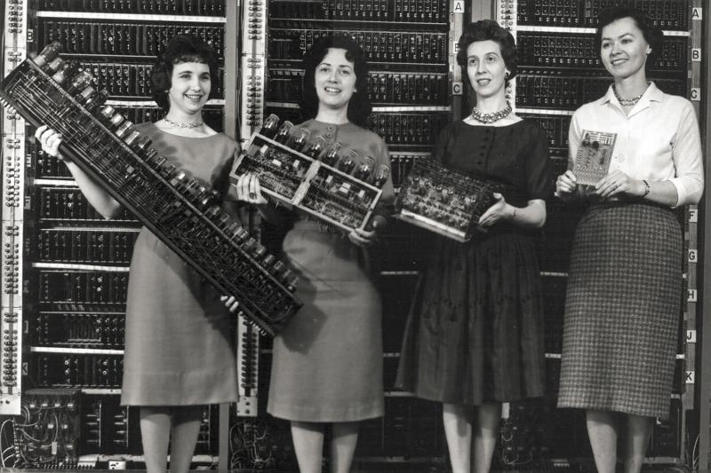 Pokazujemy jeszcze jedno pouczajace zdjęcie z epoki - oto cztery panie prezentują fragmenty kolejnych urządzeń liczących, od Eniaca poczynając: Patsy Simmers - ENIAC, Gail Taylor - EDVAC, Milly Beck - ORDVAC i Norma Stec z częścią BRLESC-I. Daje się zauważyć szybko postępująca miniaturyzacja sprzętu.