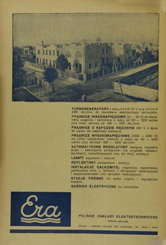 ....Fabryka „ERA” została powołana jako Polskie Zakłady Elektrotechniczne Spółka Akcyjna dzięki kapitałowi czesko-polskiemu i w 1927 r. rozpoczęła działalność produkcyjną. Produkcja obejmowała osprzęt elektrotechniczny dla instalacji oświetleniowych w różnych środkach transportu. Głównym odbiorcą w pierwszym okresie były Polskie Koleje Państwowe – PKP. W latach 30. uruchomiono również produkcję zbrojeniową, m.in. prądnic i reflektorów dla czołgów.