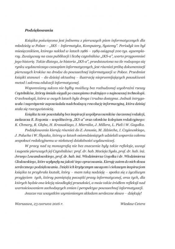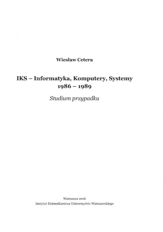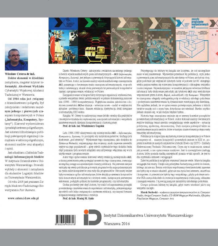 Dr hab. inż. Wiesław Cetera przekazuje portalowi monografię czasopisma komputerowego IKS Informatyka Komputery Systemy. Wychodziło ono w latach 1986 - 1989 jako dodatek do gazety codziennej Wojska Polskiego Żołnierz Wolności. Redakcja dołożyła starań, aby uniknąć w dodatku prymitywnej propagandy -naklad sięgający 200 tys. egz. jest dowodem, że to się udało. W trakcie wydawania oprcowano 4 specjalistyczne dodatki zawierające programy do popularnych wówczas mikrokomputerów typu Spectrum czy Atari.