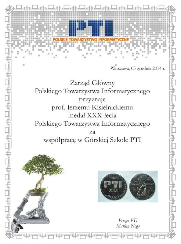 Profesor był członkiem założycielem PTI w 1981 r., a w latach 2001 - 2008 przewodniczył Radzie Programowej Górskiej Szkoły Informatyki PTI w Szczyrku. Wkład Profesora w organizację konferencji był znaczący, co potwierdzały wystąpienia prelegentów i liczne grono uczestników. Istotnym dorobkiem konferencji był przegląd metod oceny efektywności inwestycji informatycznych. W uznaniu zasług dla konferencji Profesor Jerzy Kisielnicki został wyróżniony w 2014 r. Medalem XXX-lecia PTI.