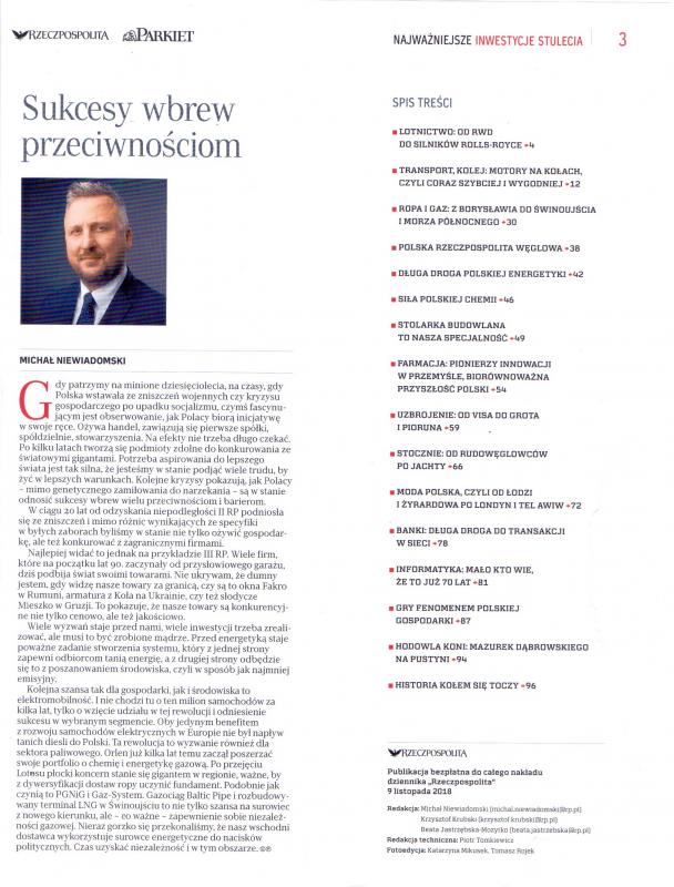 Dzisiejsze wydanie dziennika Rzeczpospolita zawiera ciekawą wkładkę - Najważniejsze inwestycje stulecia. W szeregu artykułów omówiono kilkanaście branż przemysłowych pokazując ich rozwój (i upadek) na przestrzeni 100 lat.