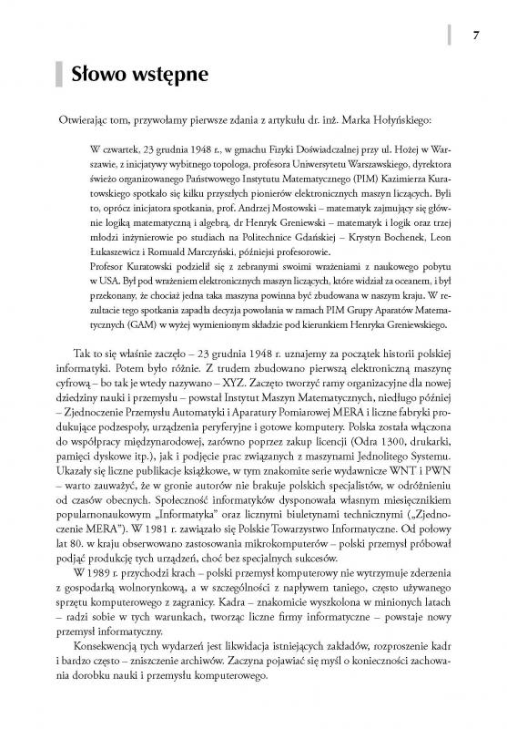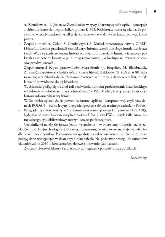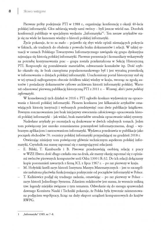 Z satysfakcją informujemy o wynikach konkursu historycznego PTI - dwa tomy wydrukowane, w maju zacznie się wysyłka do PT Członkow PTI i do uczelnianych bibliotek. Prezentowany tom zawiera szereg monograficznych artykułów relacjonujących dzieje zakladów przemysłowych i instytucji (IMM, Elwro, Mera-Błonie), rozwój systemów komputerowych (Odra-1103, Odra-1300, Riad, K-202) oraz wybrane rozwiązania przemysłowe (hutnictwo, przemysł lotniczy). Po raz pierwszy w kraju mamy okazję zapoznać się z opisem systemu bazy danych RODAN.